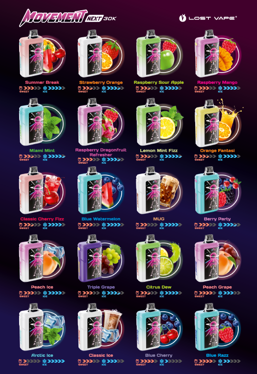 Discover the Lost Vape Movement NEXT 30K Disposable, 3 operational modes, 1. Reg 2. boost 3. turbo Featuring a large Mega HD screen to display battery and e-Juice levels. Outputting delicious clouds of vapor through the dual mesh coils, the Lost Vape Movement NEXT 30K is Canada's largest Puff device on the market and the first wrap around screen!